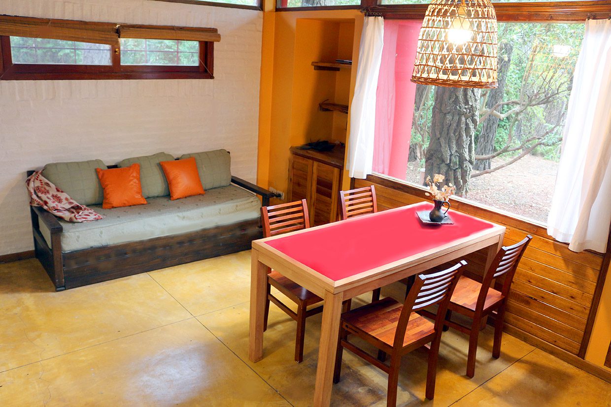 Comedor y living con divan cama de 2 camas de 1 plaza. Amplios ventanales en todos los ambientes con vista al bosque. Aire acondicionado split frío/calor.
