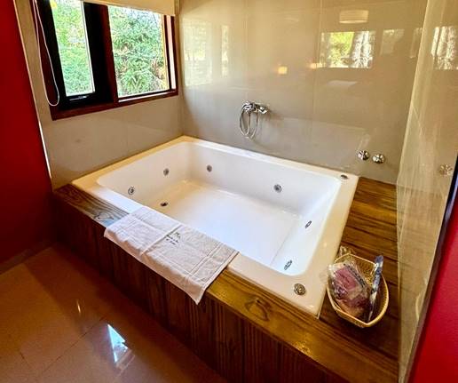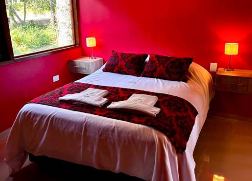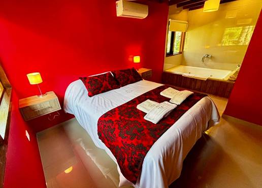 dormitorio con jacuzzi doble, baño con ducha, cocina con isla y concepto abierto (heladera con freezer, microondas, horno a gas, tostadora, cafetera eléctrica y vajilla completa).
