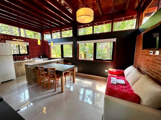 Un ambiente luminoso y acogedor, ideal para disfrutar del confort y la serenidad del bosque.