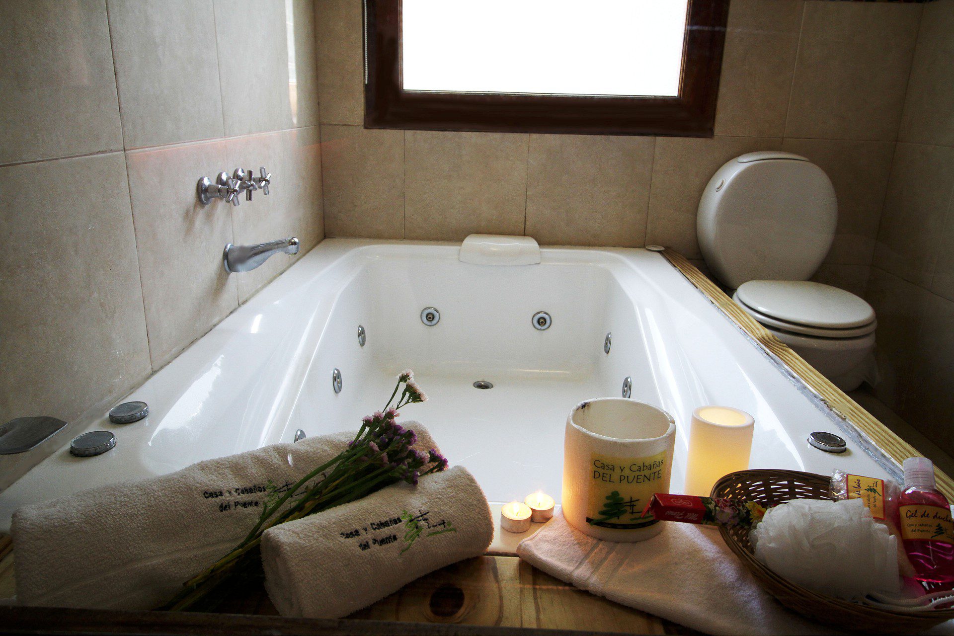 Jacuzzi doble en el baño con vidriado hacia la habitación.