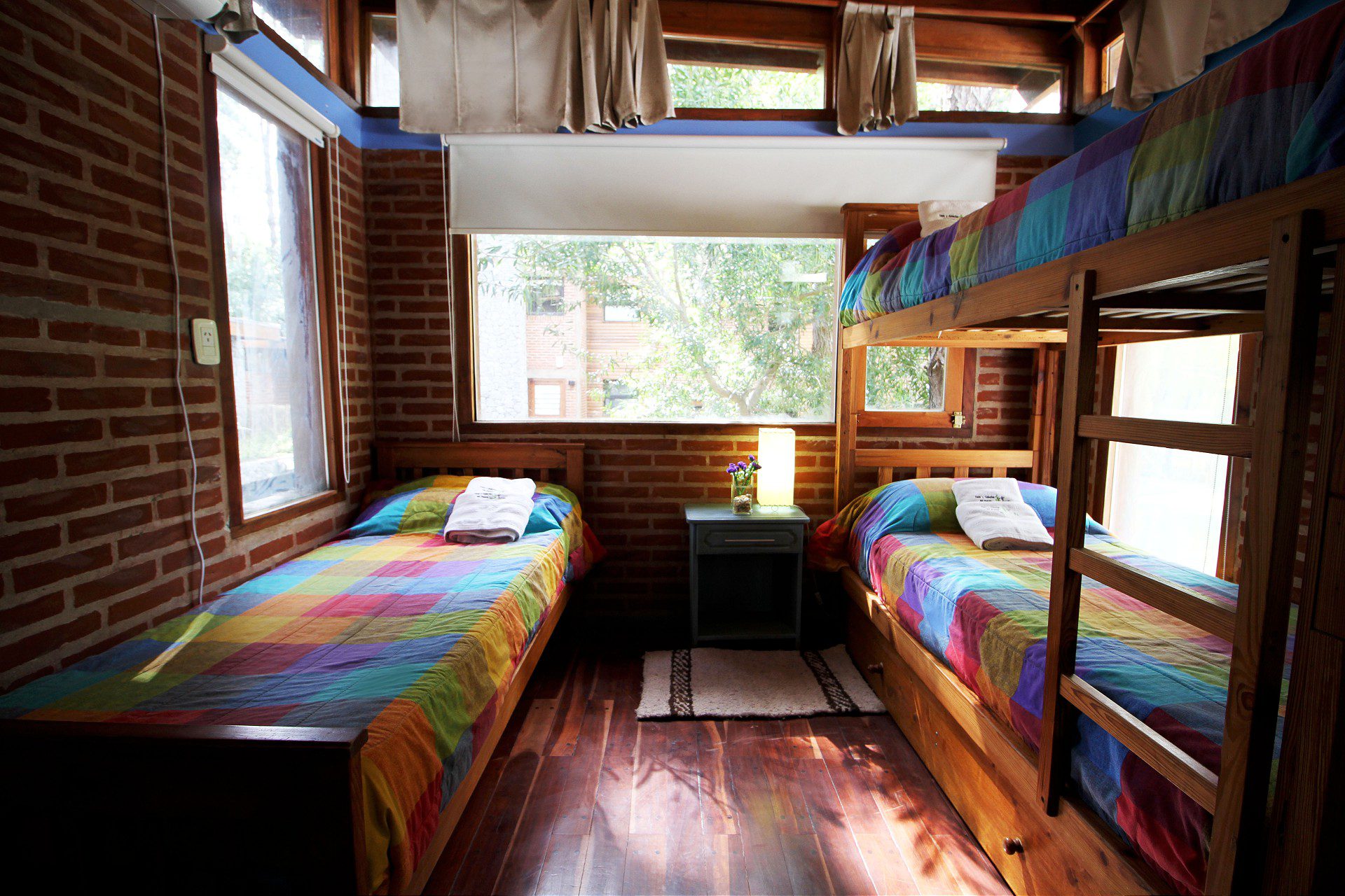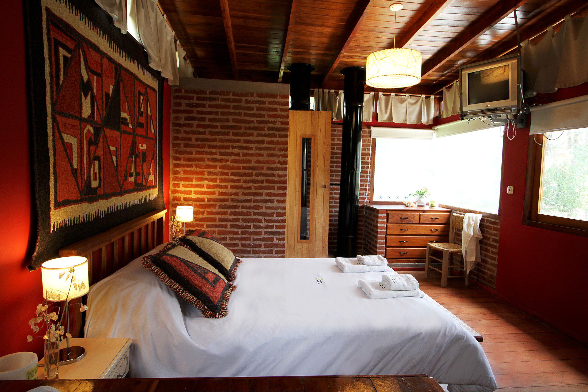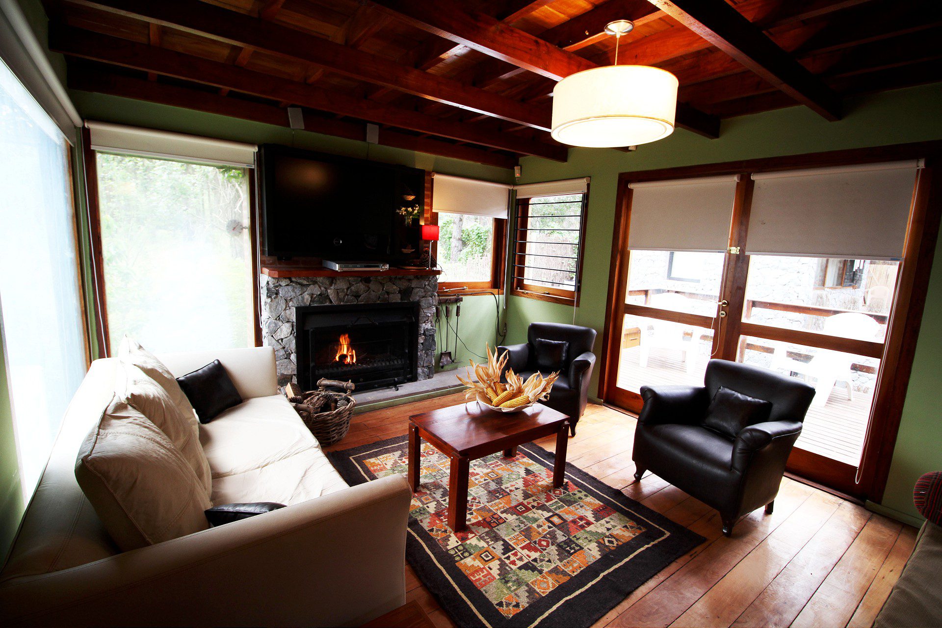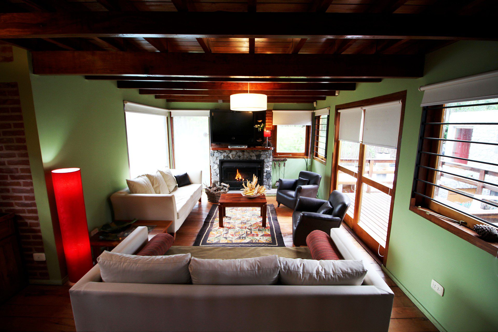 Living vidriado al bosque, televisor LCD 42″ y cable, equipo DVD, hogar a leña, juegos de sillones en ecocuero,y sillón cama con 2 camas de 1 plaza. Deck aterrazado, exterior, dormitorio con 4 camas de 1 plaza y baño en suite completo, Aire acondicionado por Splits Frío-Calor en el dormitorio.